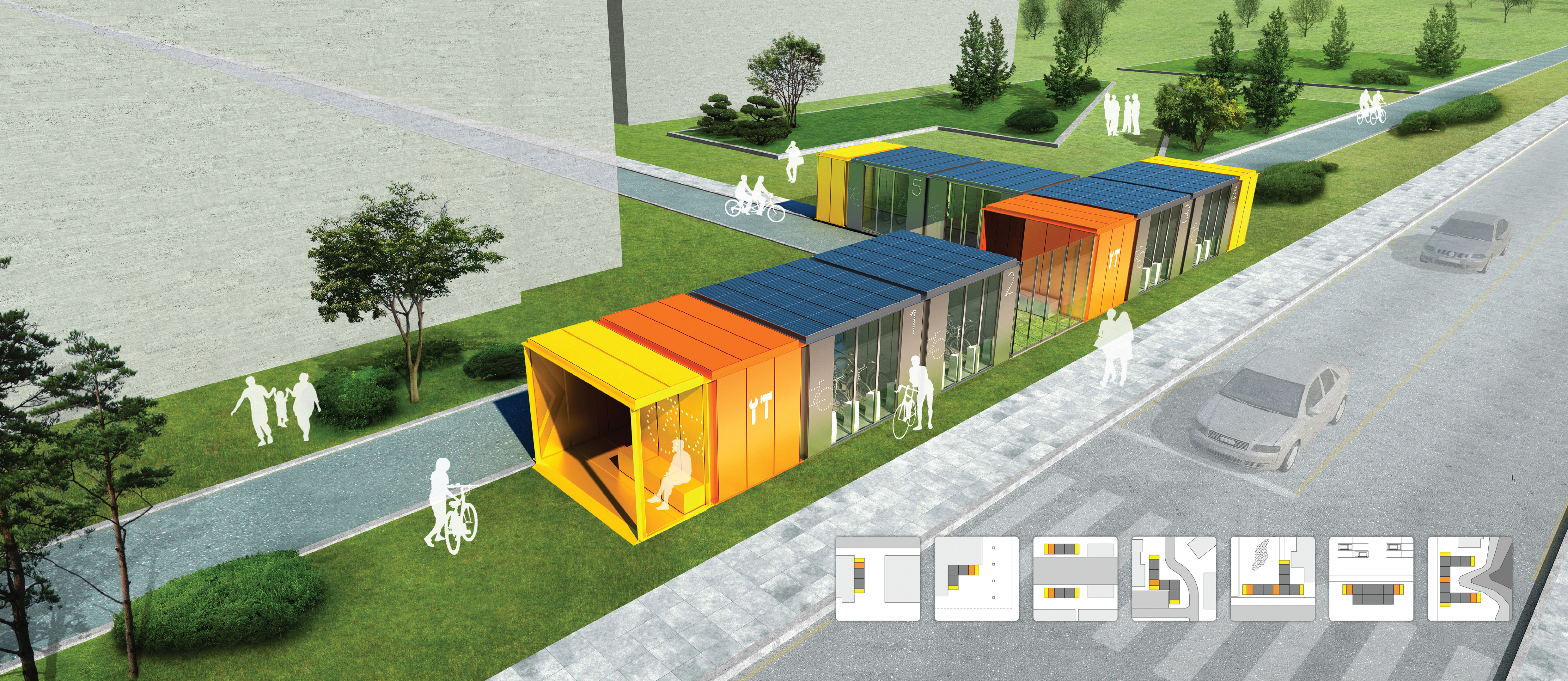 WIZBRICK prevents from theft and damage, which are chronic problems of existing racks, with management and installation more economical. The rack composed of 3.45m X 0.65m module is consisted of a lock device and bicycle pump, and wheel cleaning facility. The systemized module can be re-arranged into various configurations that may fit better to the surrounding environments. Additionally, with electricity sourced from its solar system, basic functions such as entering, storing, managing are powered along with extra functions of supplying information, night light and encouraged resting area.