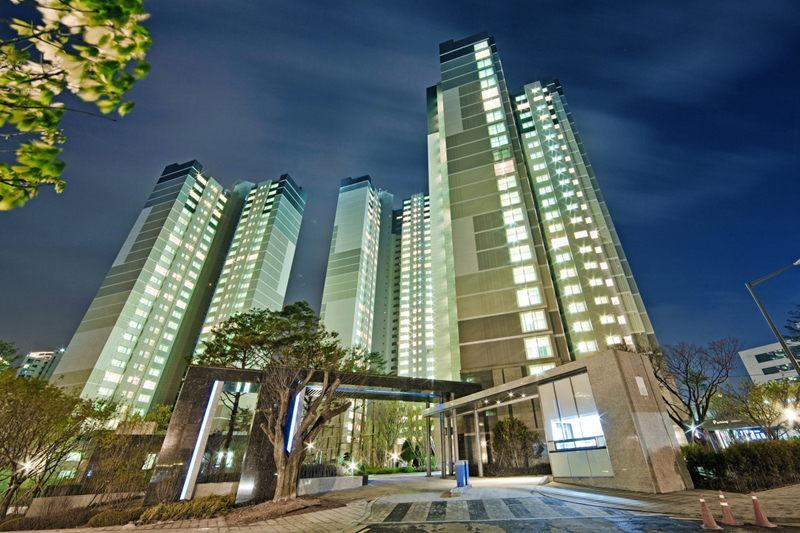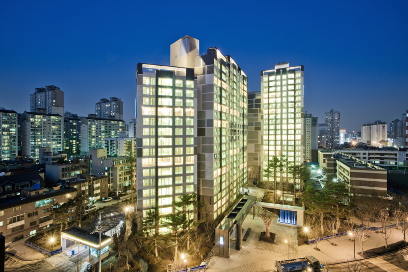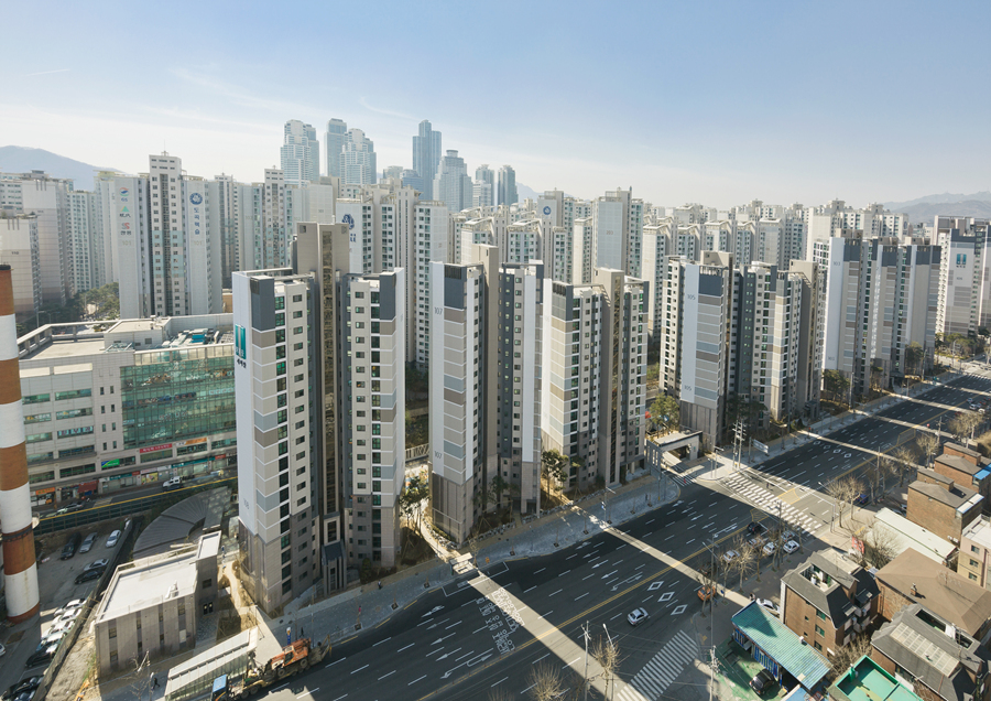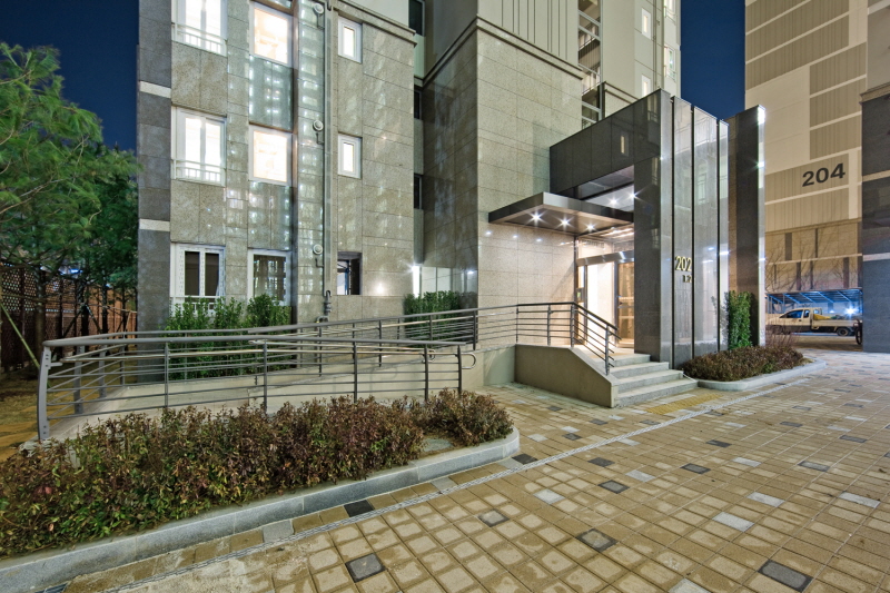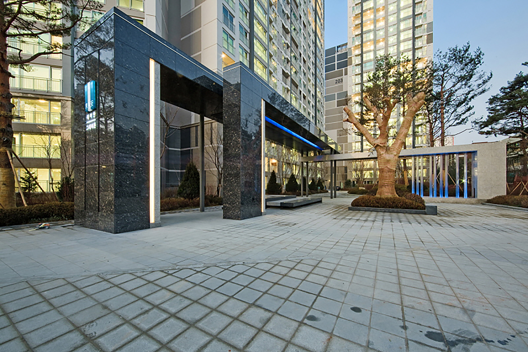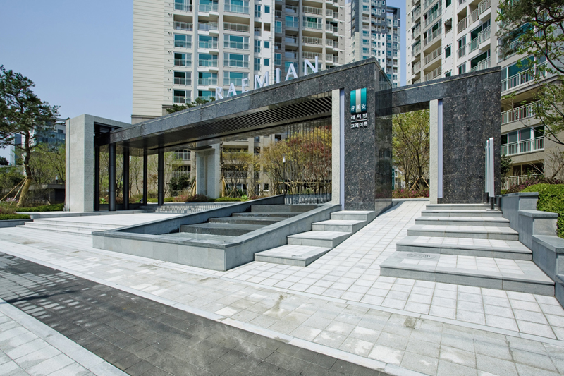 The Raemian Greaten apartment complex is composed of three distinct districts, each developed during different periods yet unified through a consistent design language. This coherence transforms the districts into a single harmonious town. The design extends beyond the apartment blocks to include gates, security offices, sunken gardens, and retaining walls, ensuring that every element maintains uniformity.
