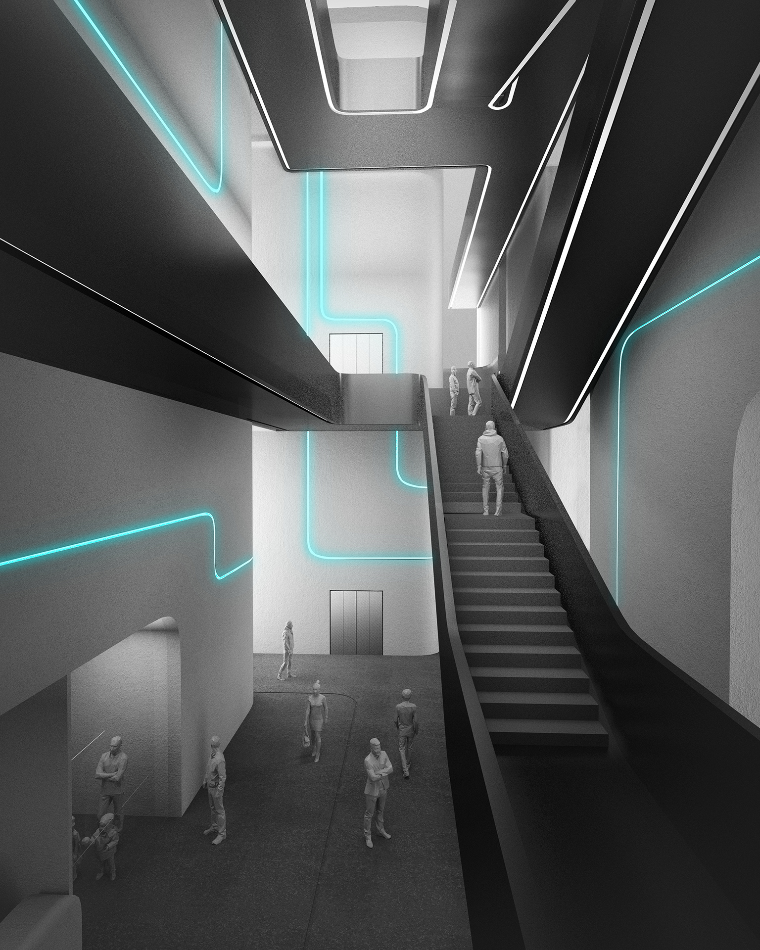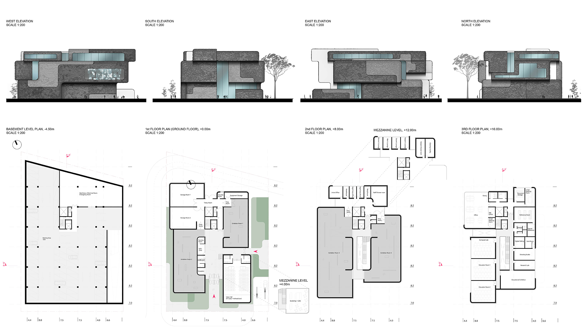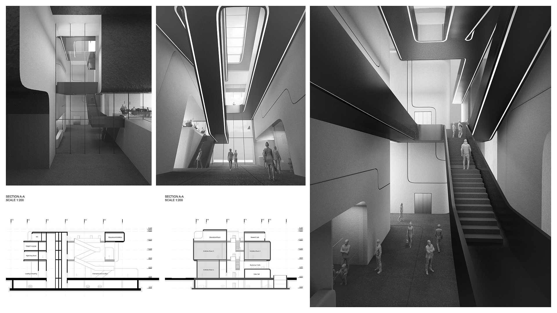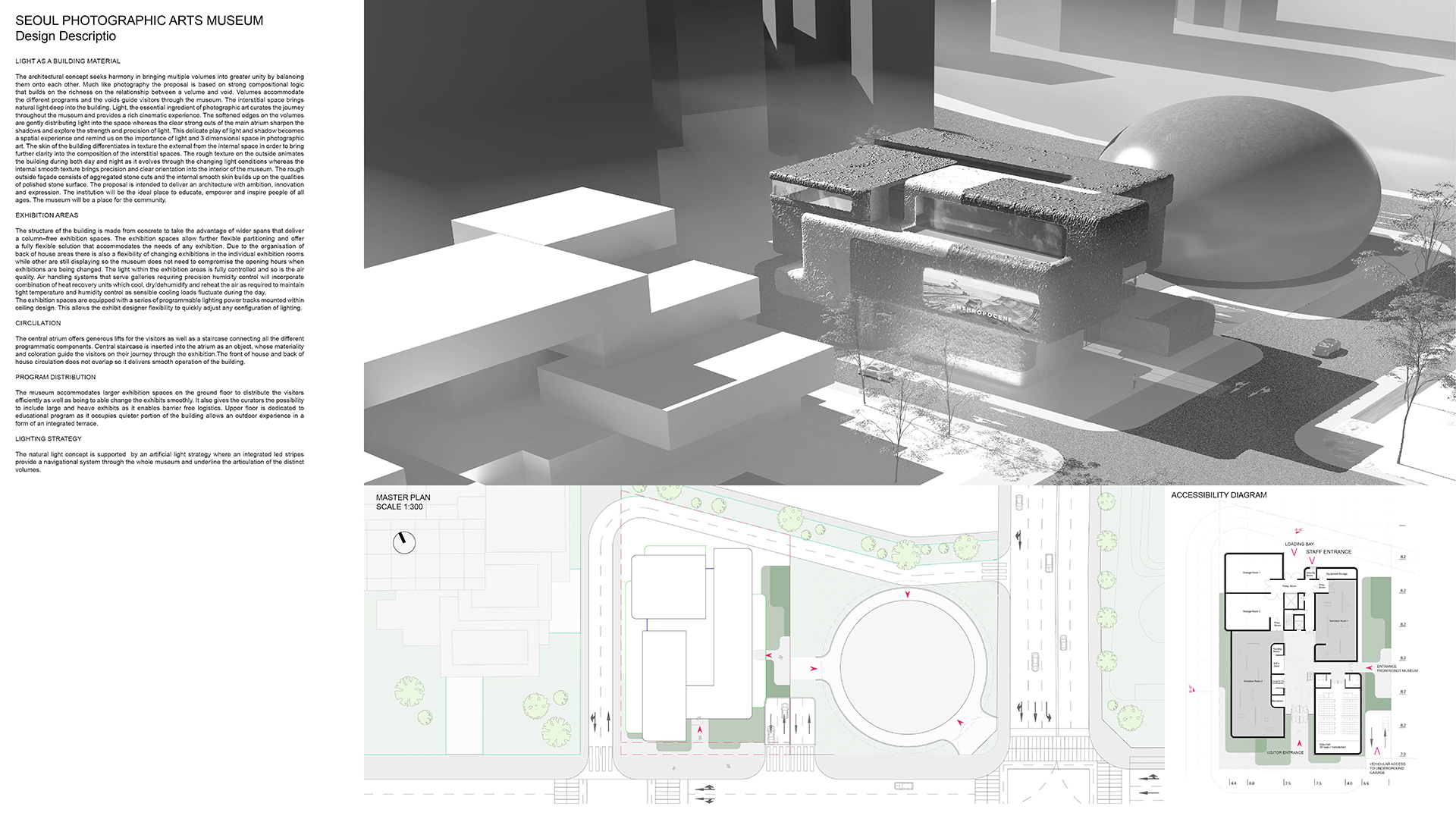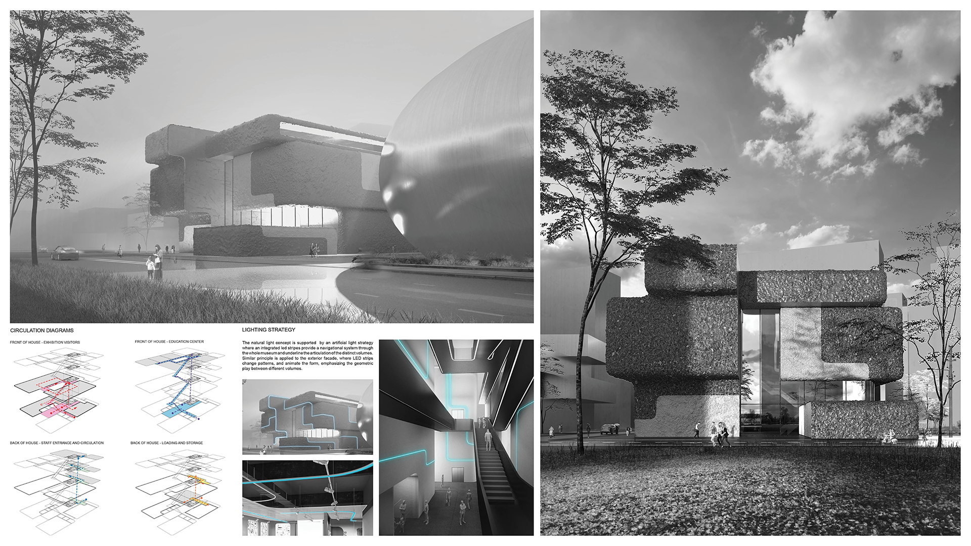 Volumes accommodate the different programs and the voids guide visitors through the museum. The interstitial space brings natural light deep into the building. Light, the essential ingredient of photographic art curates the journey throughout the museum and provides a rich cinematic experience. The softened edges on the volumes are gently distributing light into the space whereas the clear strong cuts of the main atrium sharpen the shadows and explore the strength and precision of light. This delicate play of light and shadow becomes a spatial experience and remind us on the importance of light and 3-dimensional space in photographic art. The skin of the building differentiates in texture the external from the internal space in order to bring further clarity into the composition of the interstitial spaces.