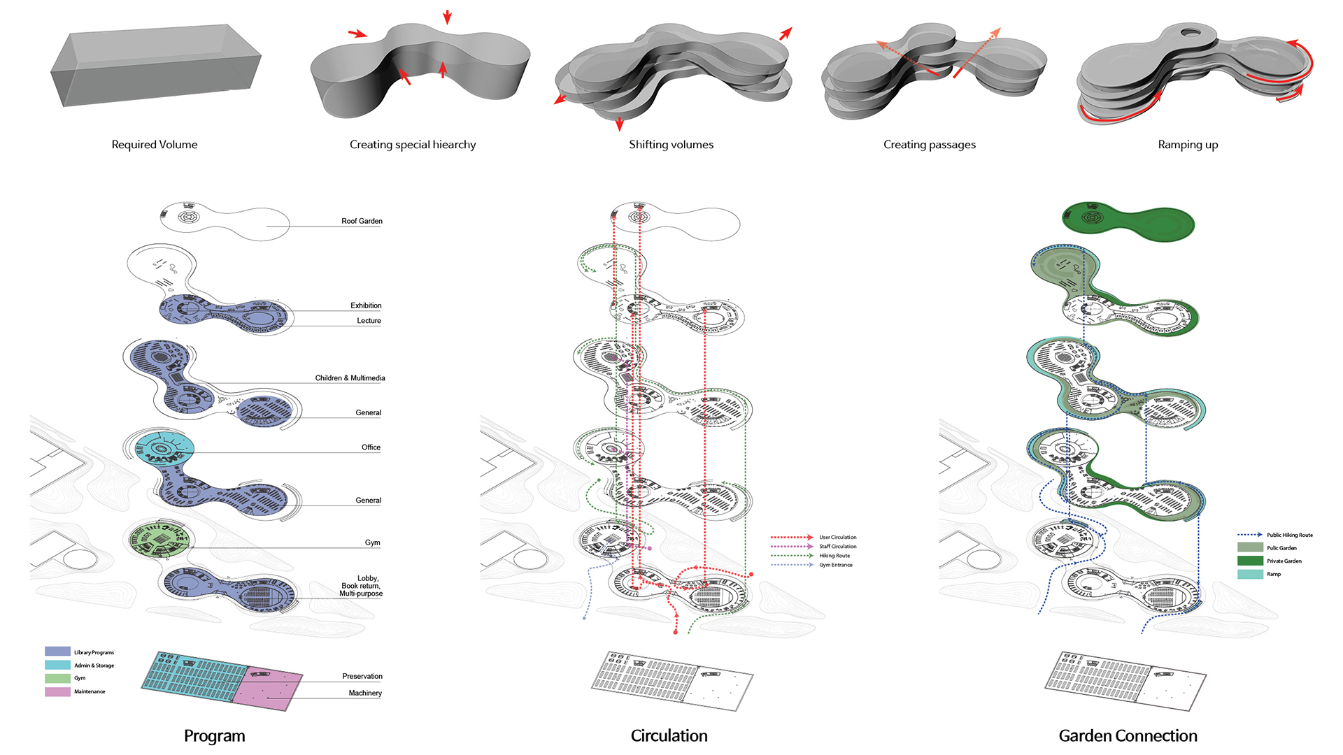 Stacked volumes shift and disconnect, creating a series of gardens and terraces, some of which are accessible to the public, through ramps which wrap around the building, and take pedestrians from the park and series of elevated gardens, to the library’s rooftop garden.