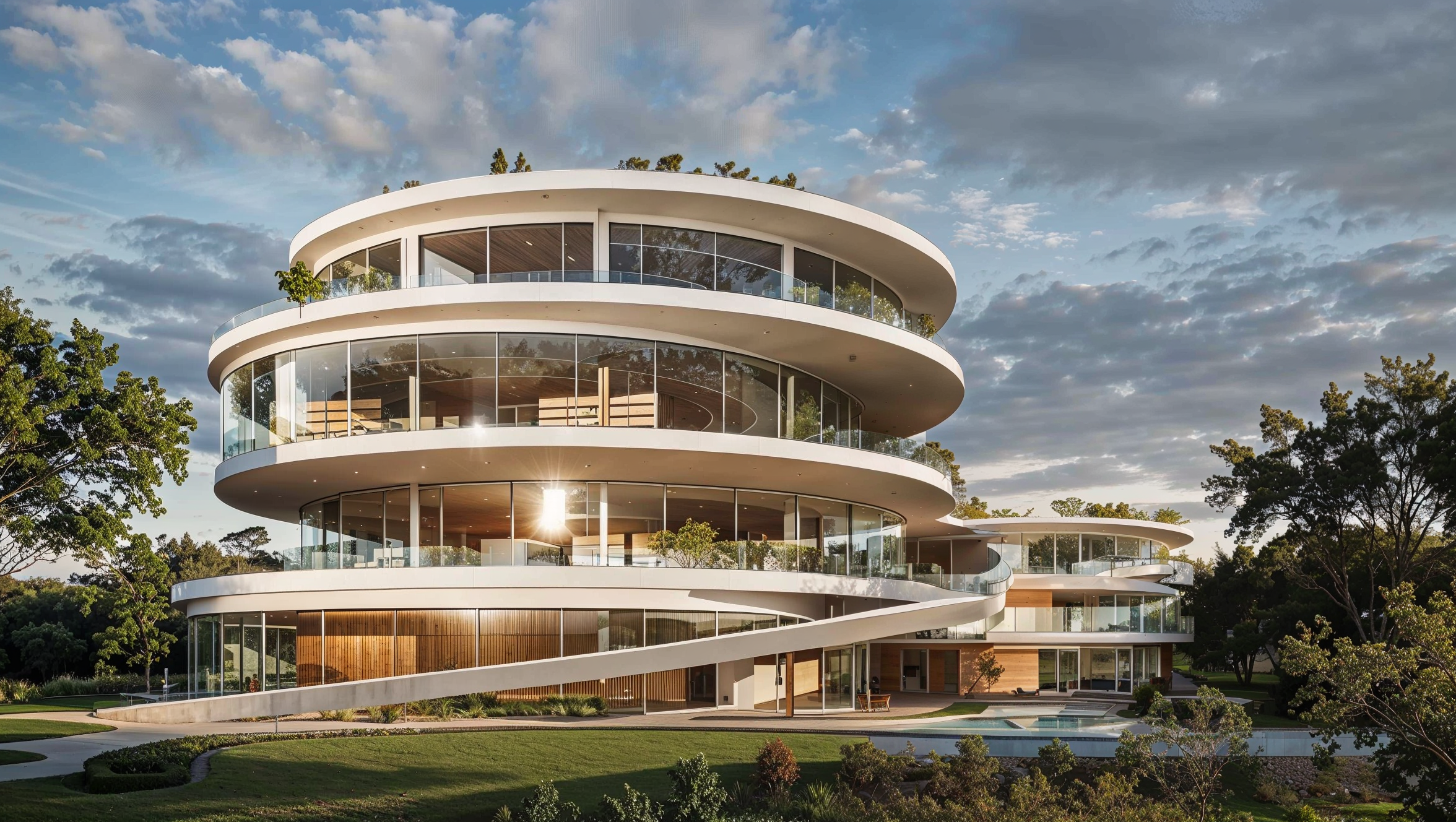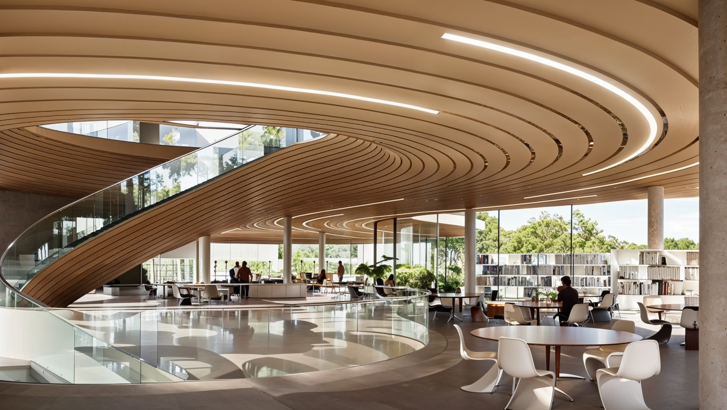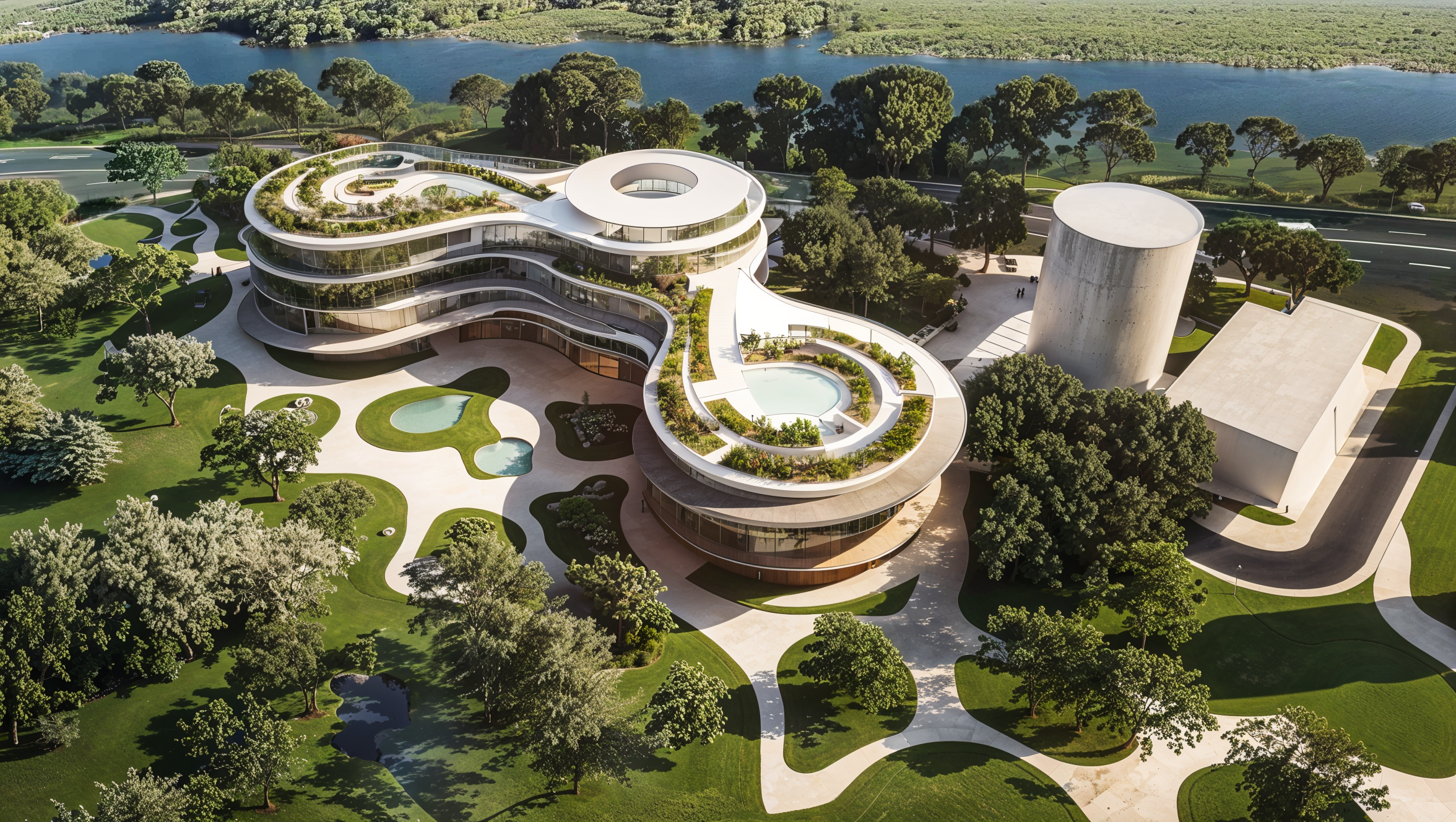 Sitting as an object in the park, the library building takes the most out of its surroundings, blending with the park and essentially becoming its extension. The architectural concept revolves around a cluster of blended circular volumes, with the central volume acting as a spine with a generous atrium which contains the main lobby and vertical circulation for visitors. Additional programs from both remaining circles blend and mix around the atrium. East facing volume contains the gym and staff offices, while west facing volume contains additional public programs in its ground floor- the multi-purpose hall, hot-desking area and cafe.