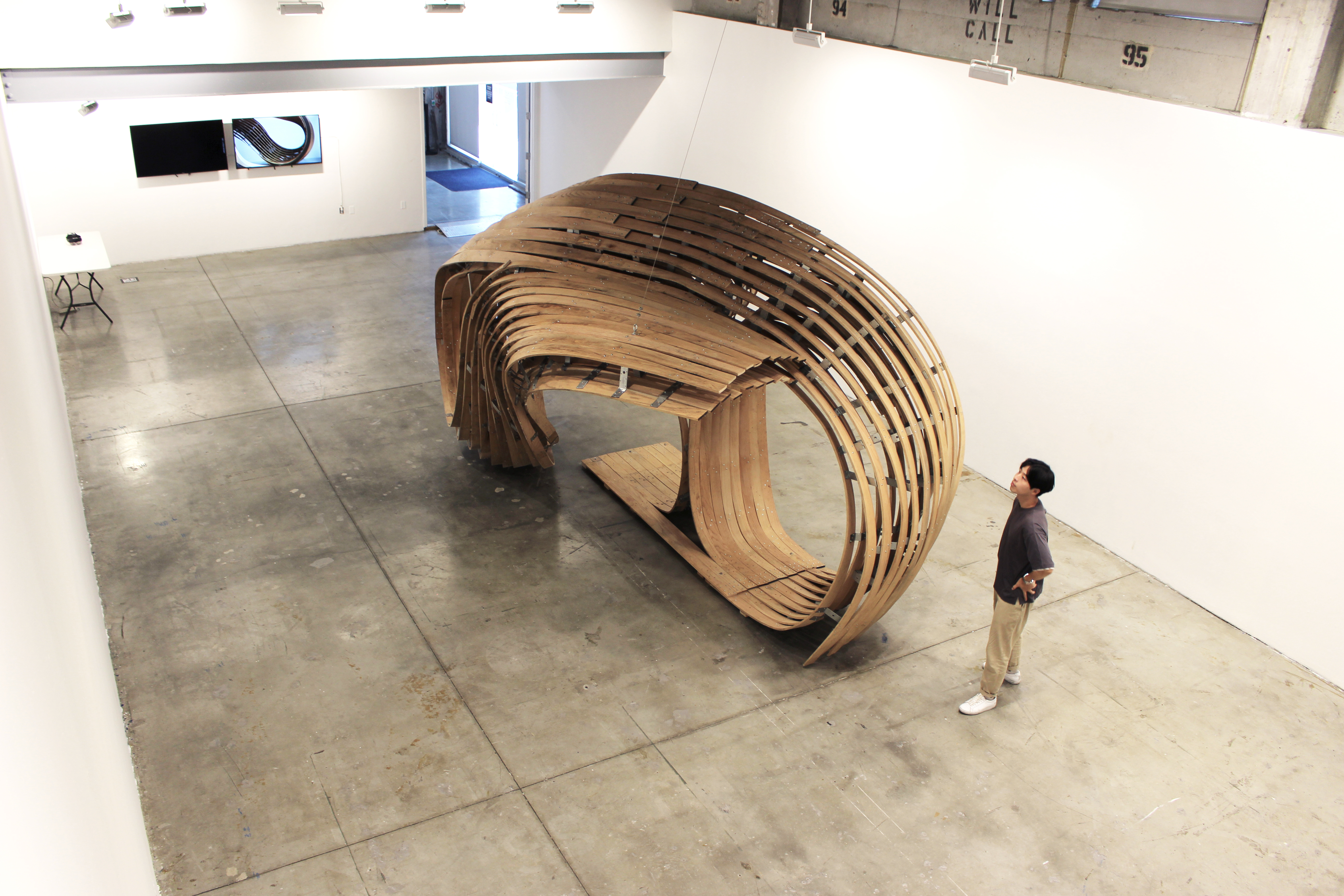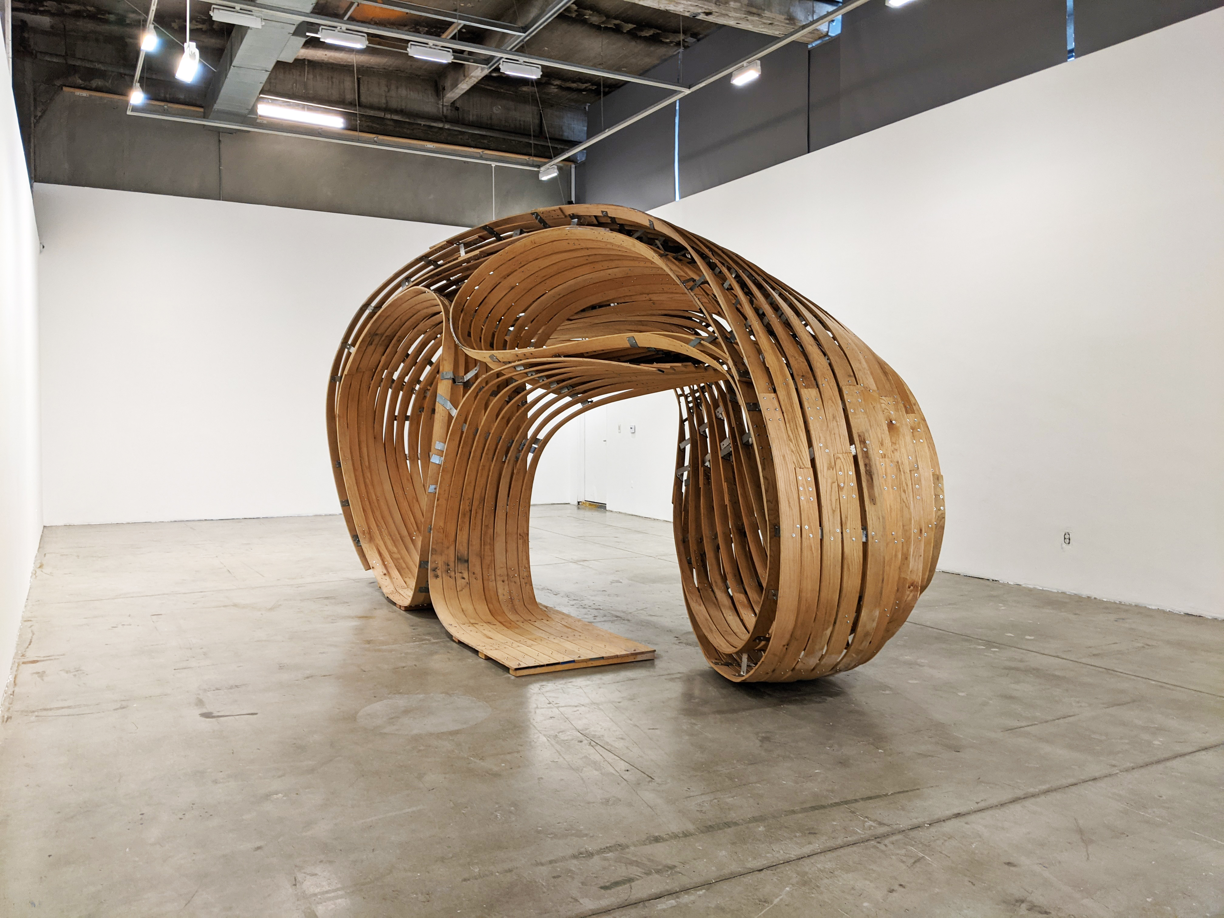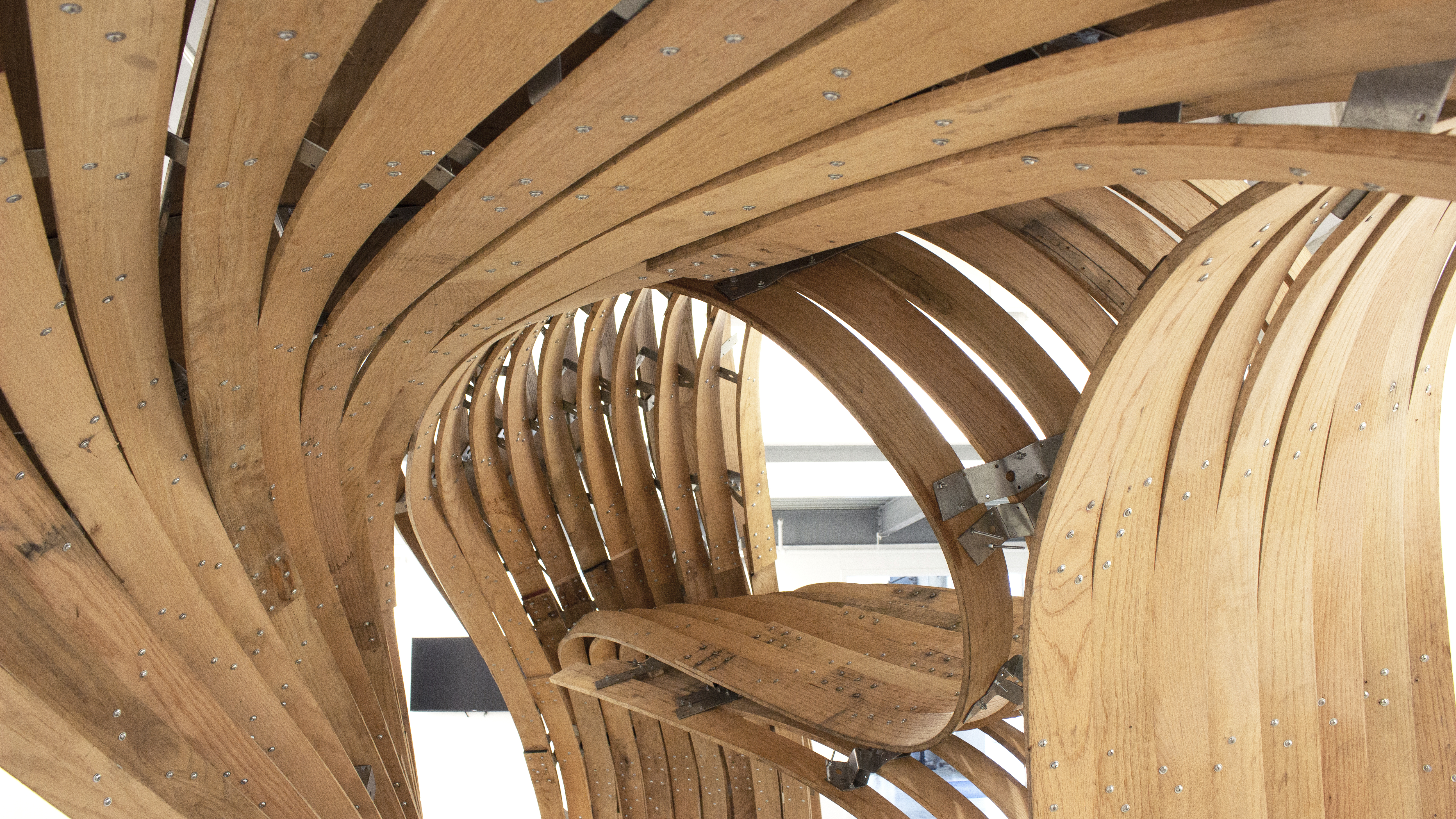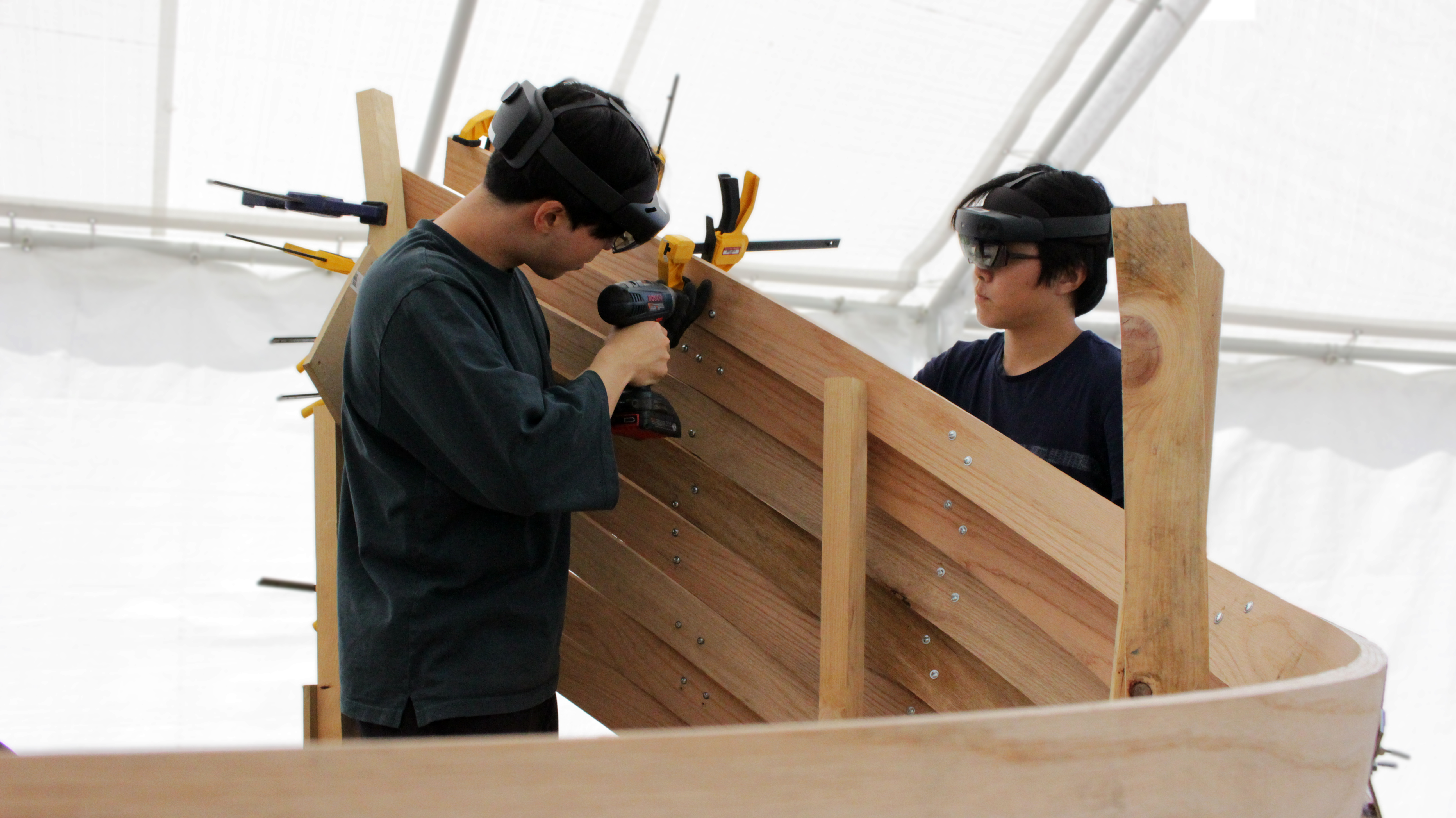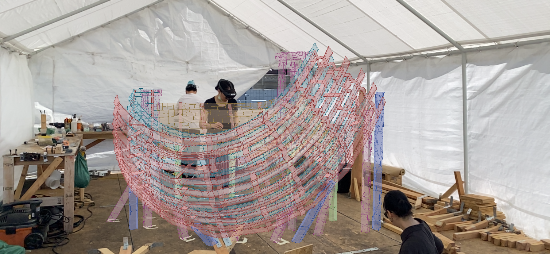 The centerpiece of the exhibition, designed in collaboration with Igor Pantic, is a structure built out of steam-bent hardwood using primitive hand tools augmented with the precision of intelligent holographic guides. It explores alternative strategies for the fabrication of digitally designed architectural structures, utilizing cutting-edgem, head-mounted devices (HMDs) to holographically assist workers in the manufacturing and assembly of highly varied components using traditional craft techniques.
