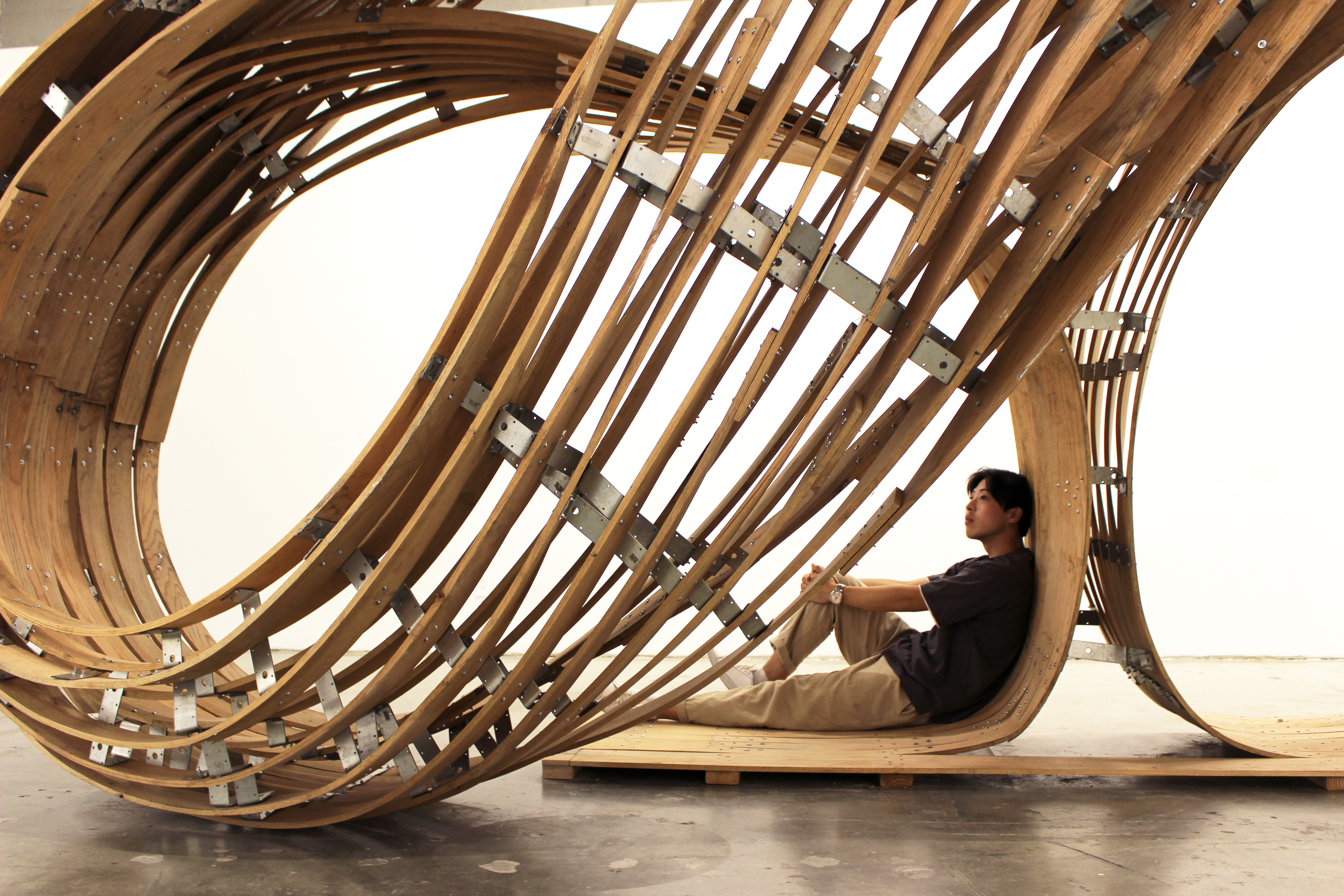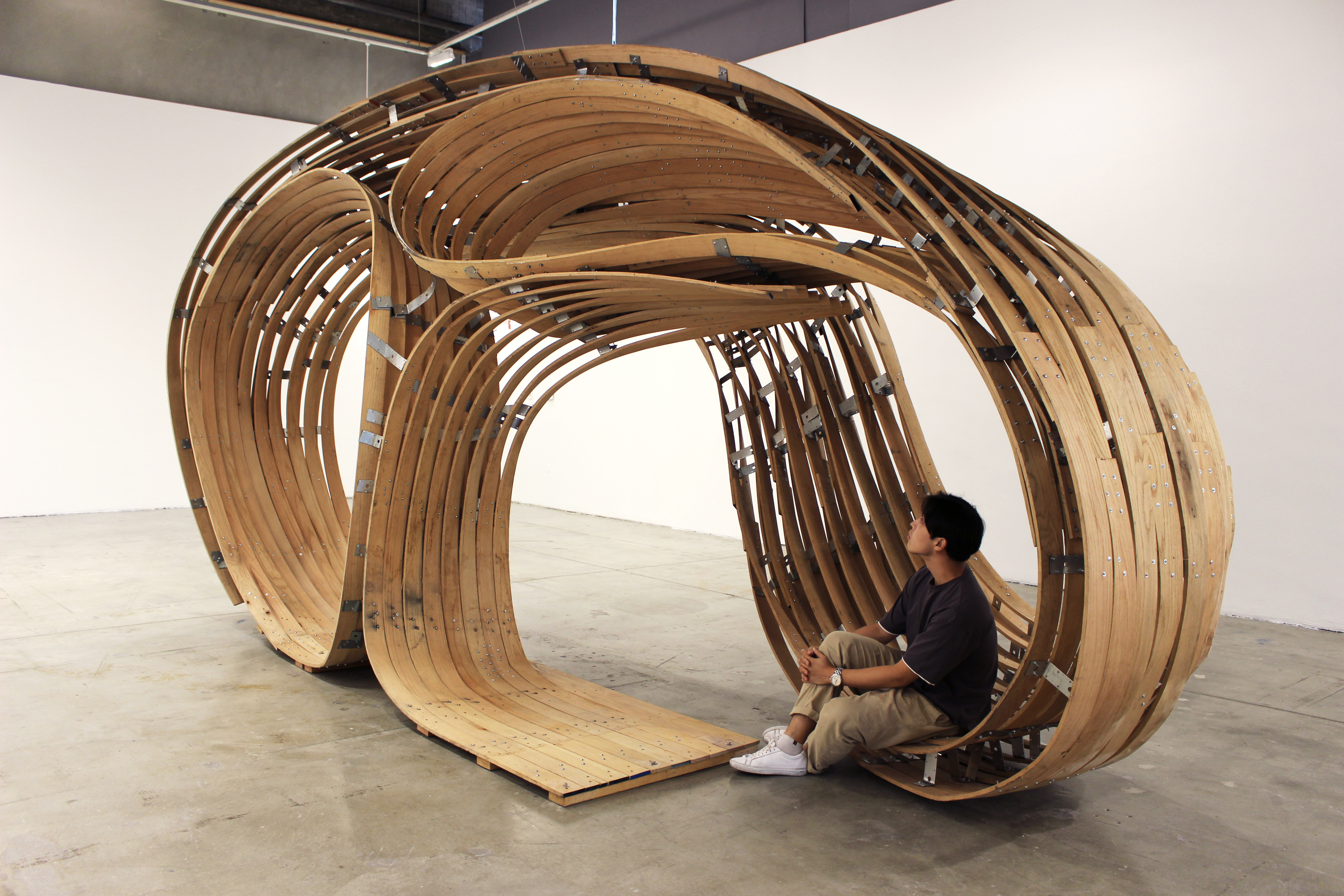 The exhibition piece itself, which is a full-scale section of a larger inhabitable space, represents a next step in the evolution of the SoomeenHamh Design’s ongoing research into complex timber structures, assembled with the assistance of AR. It builds on the methodology developed for the 2019 Tallinn Biennale Steampunk Pavilion (designed by Hahm, Pantic, Gwyllim Jahn, and Cameron Newnham), further expanding it in the realm of fully functional space.