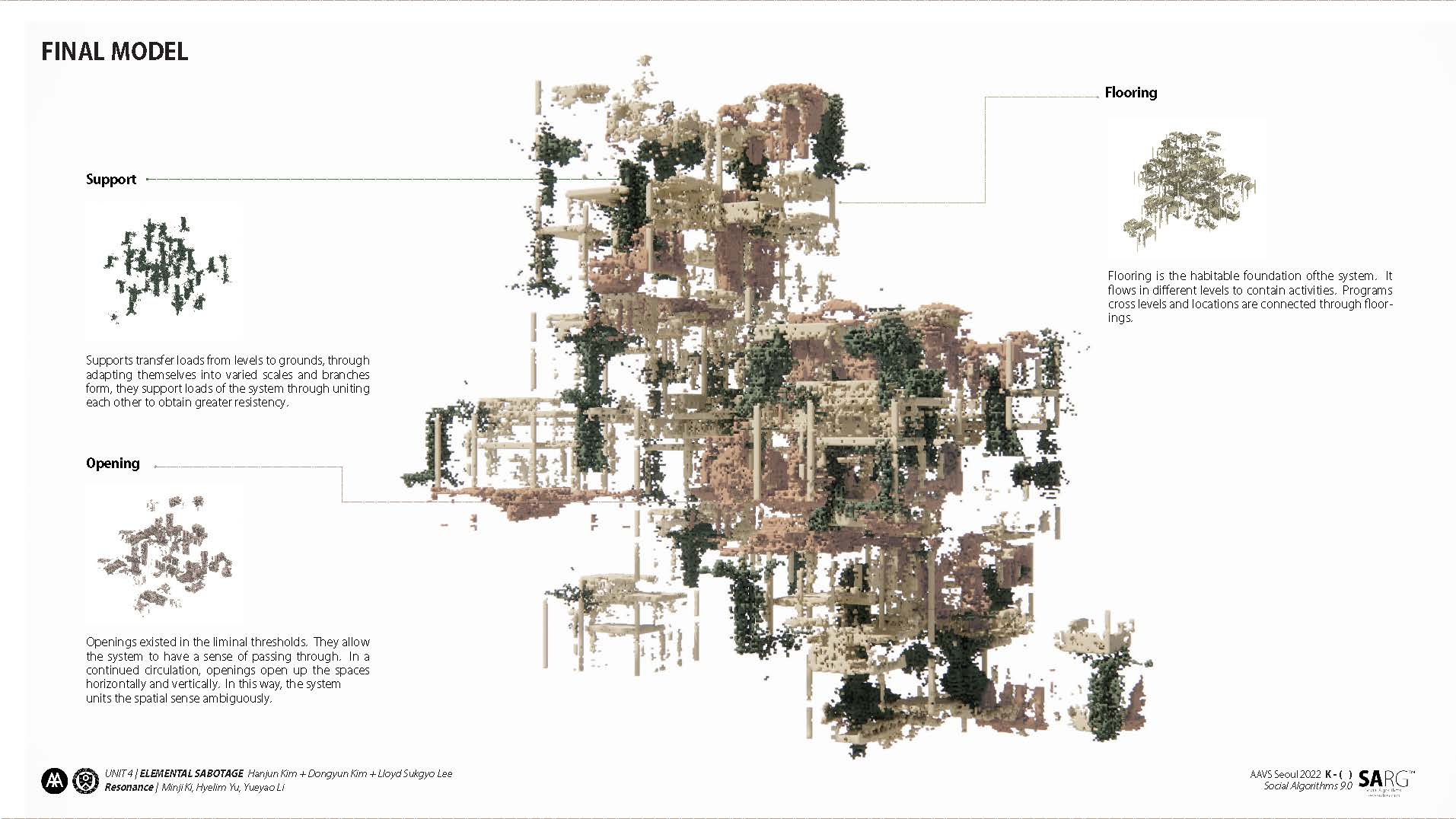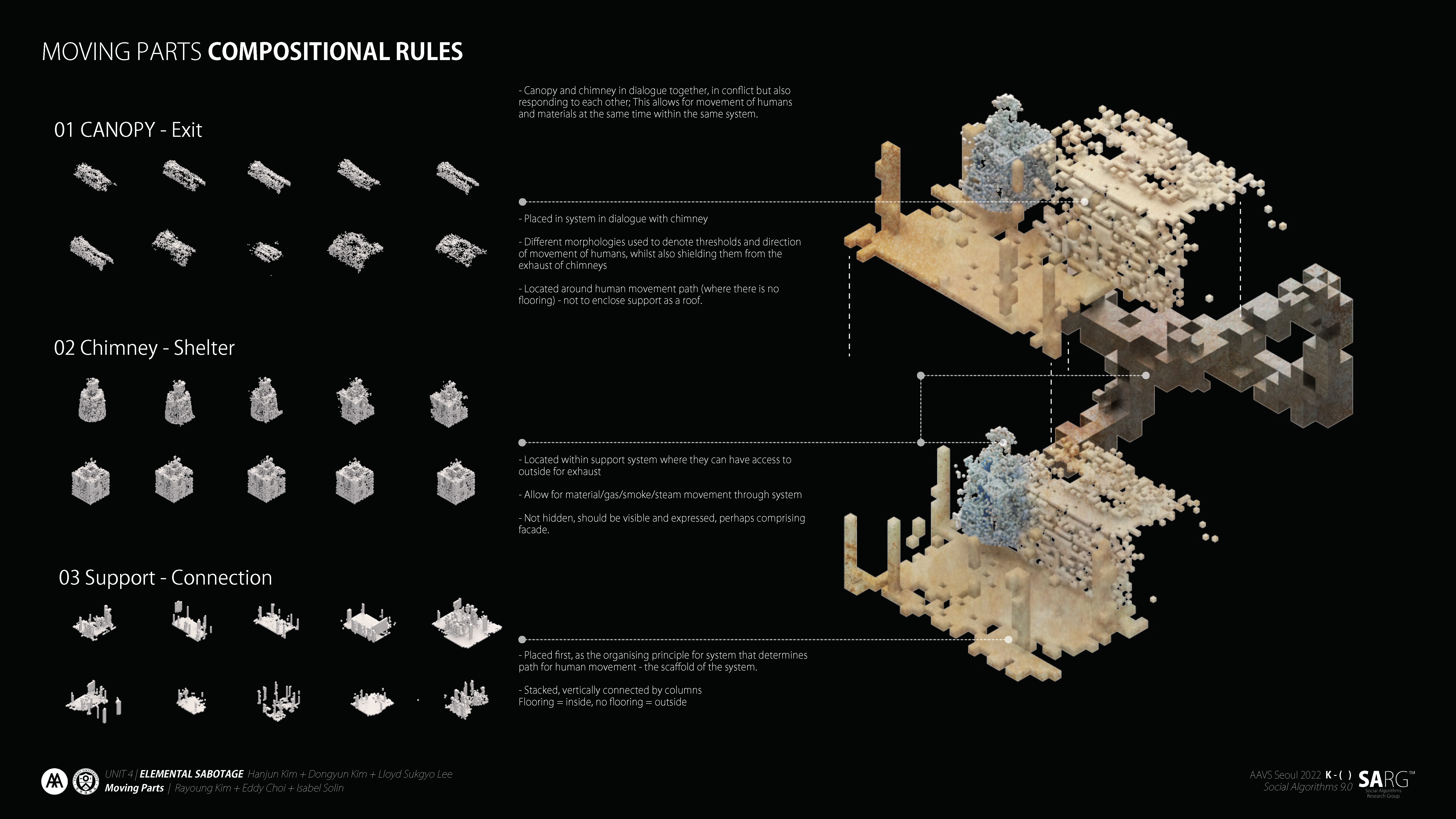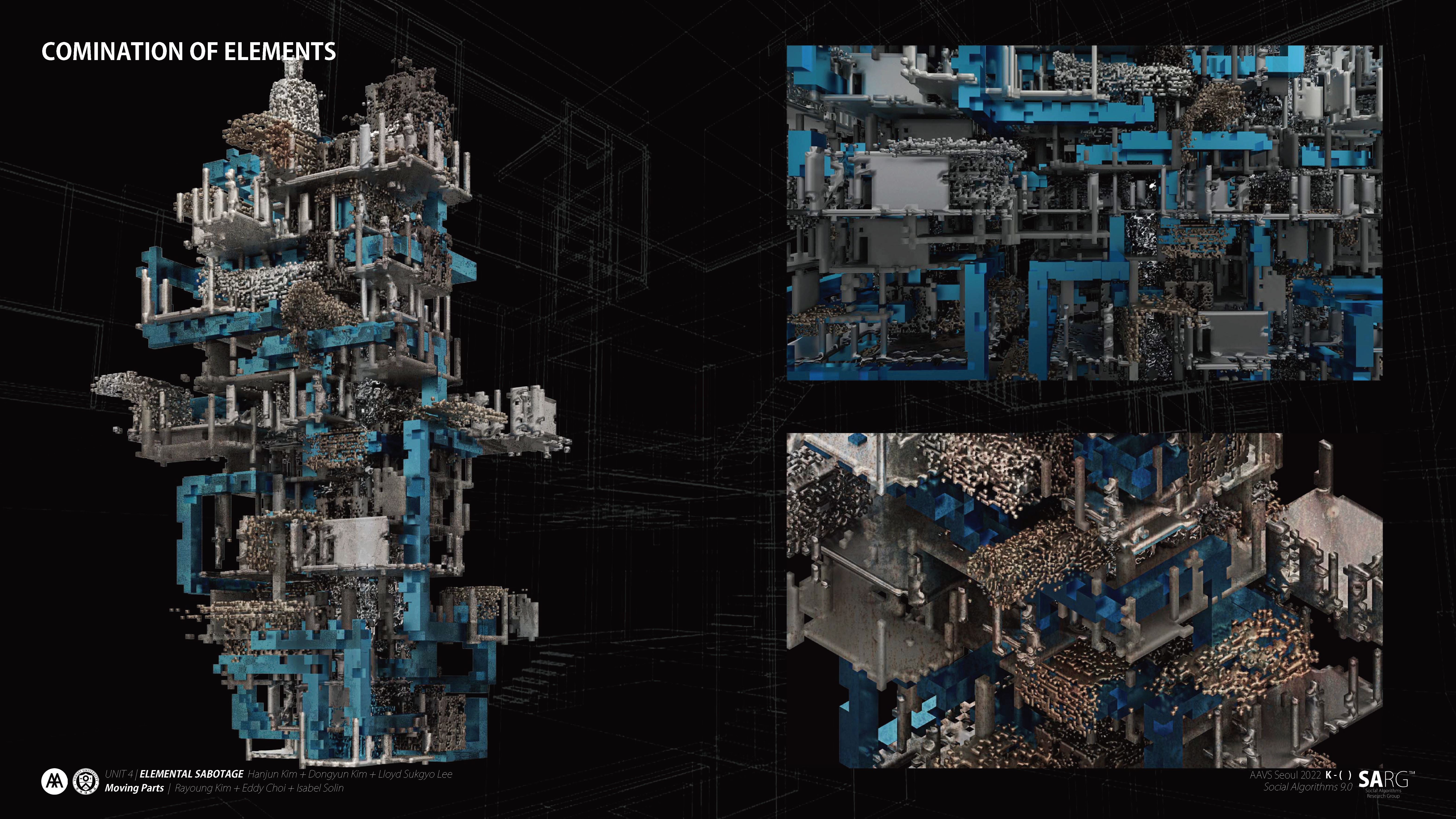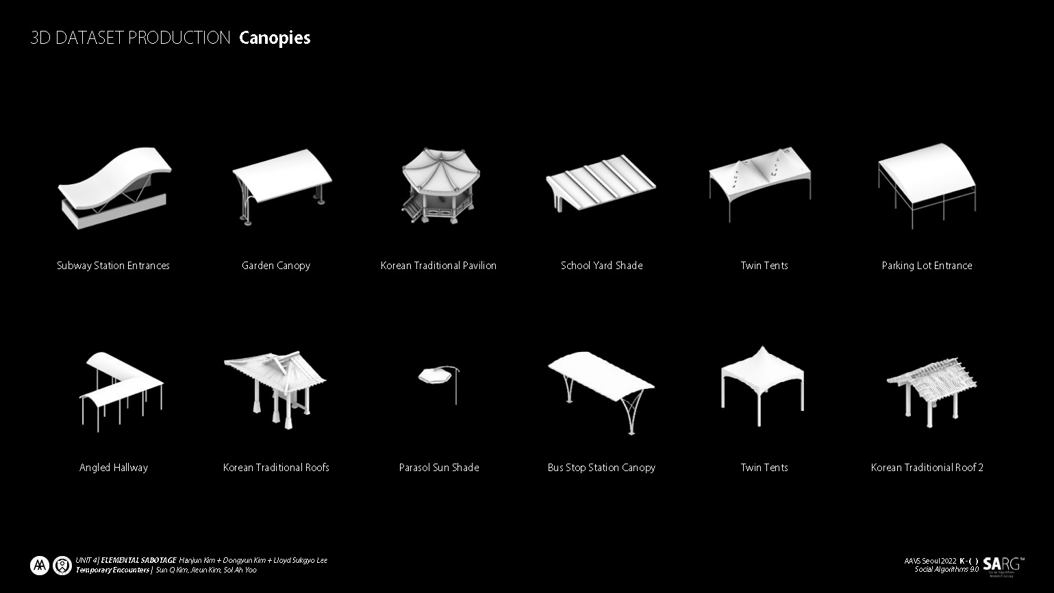 The unit aims to explore a design method that utilises latest technologies to create a culture specific design that defies design approach based on periodic and stylistic understandings of architecture. Students will be given a typology specific to Korea which they have to incorporate into a design manifestation. The design should integrate newly developed elements generated through GANs(Generative Adversary Network—in this case, StyleGAN and 3D GAN). Various architectural elements that were used in Korea throughout different eras will be first divided according to their functions. Elements in each function category, all from different eras, merge and give birth to new elements that incorporate the Korean understanding of functional morphologies. These new GAN-driven elements transcends periodic definition and will lead to a design that is culture specific.