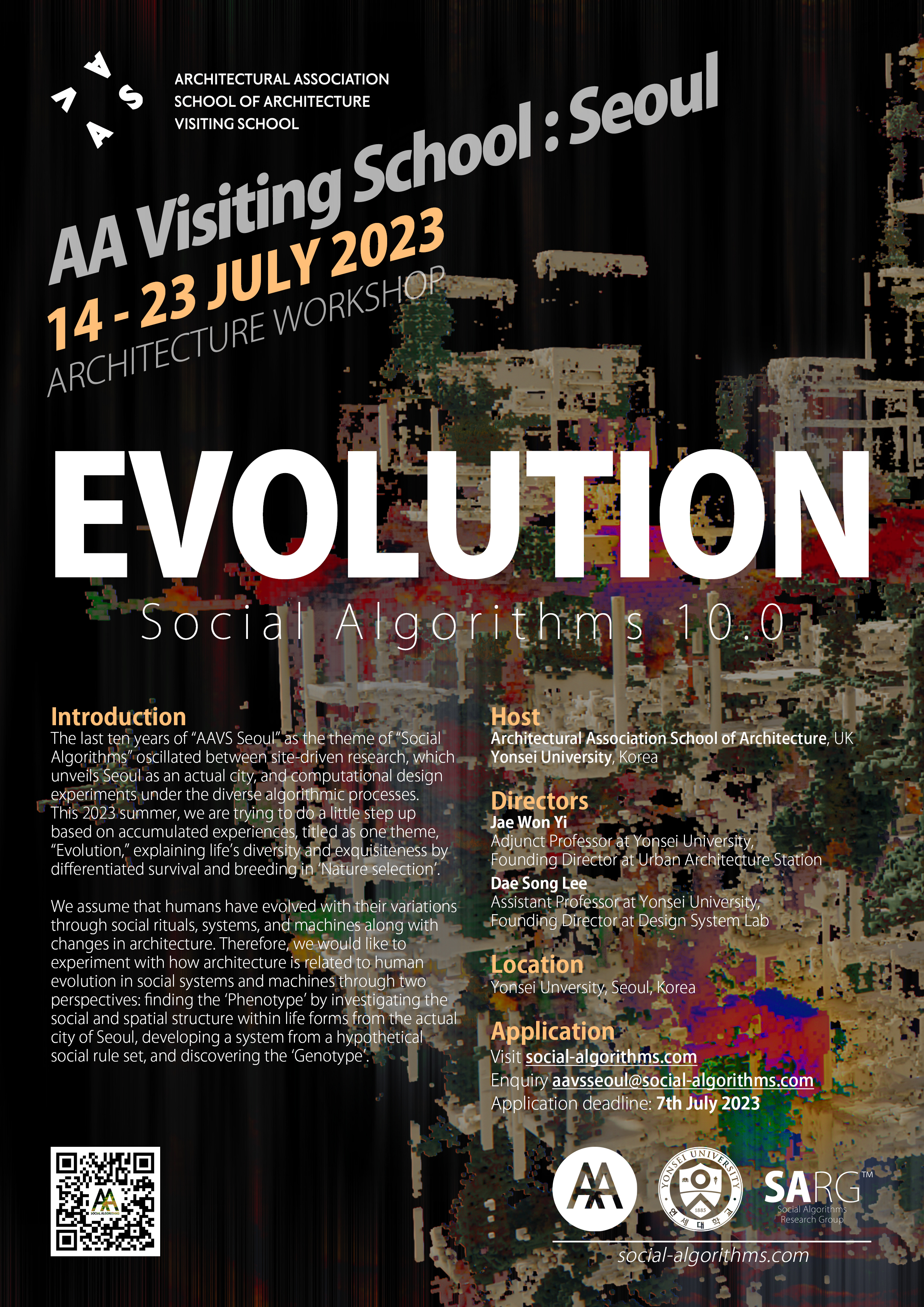 The last ten years of “AAVS Seoul” as the theme of “Social Algorithms” oscillated between site-driven research, which unveils Seoul as an actual city, and computational design experiments under the diverse algorithmic processes. This 2023 summer, we are trying to do a little step up based on accumulated experiences, titled as one theme, “Evolution,” explaining life’s diversity and exquisiteness by differentiated survival and breeding in ‘Nature selection.’ Humans have evolved with adaptations and variations through social rituals, systems, and machines, and architecture has been a crucial role in this process as an essential part of social systems. Therefore, we would like to experiment with how architecture is related to human evolution in social systems and machines.